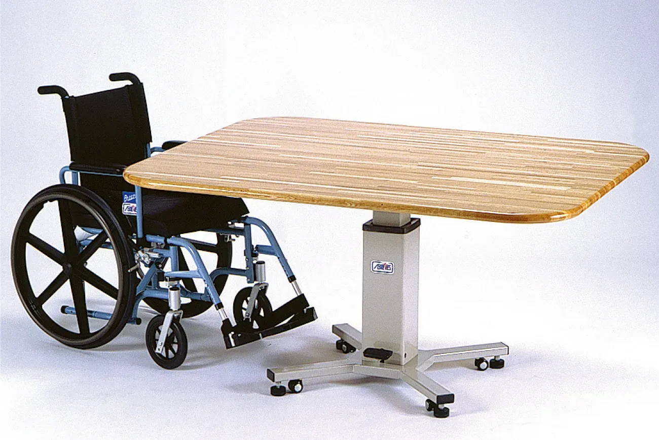 一本脚なので足元が広く、車いすでも近づきやすい作りです。天板が縦になる収納タイプもあります。