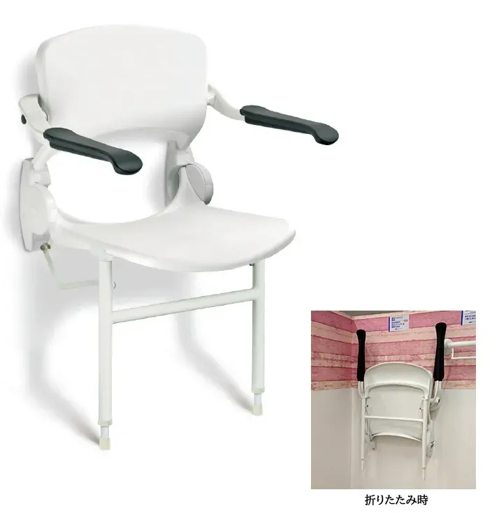 肘かけ付きで安心して使用できる、壁付けシャワーシート(脚付き)