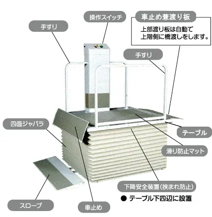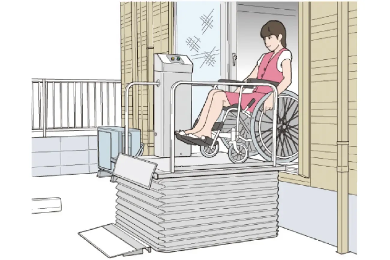 | 主な用途・対象者 | ピット工事不要の設置式の段差解消機。直進、L字乗降り可能で設置場所に自由度があります。 |