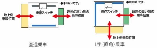 設置場所の条件により問題となるのが、地上側(段差解消機下降位置)での乗降位置です。 本機は、スロープ・車止め・渡り板・手すりの取付け位置を変えることで下図のように4つ の設置パターンの設定が可能です。 パーツの追加や追加工事等の必要はありません。これにより、設置場所に応じた乗降位置の設定が 可能なため、車いすでの家屋と屋外のスムーズな出入りが実現できます。