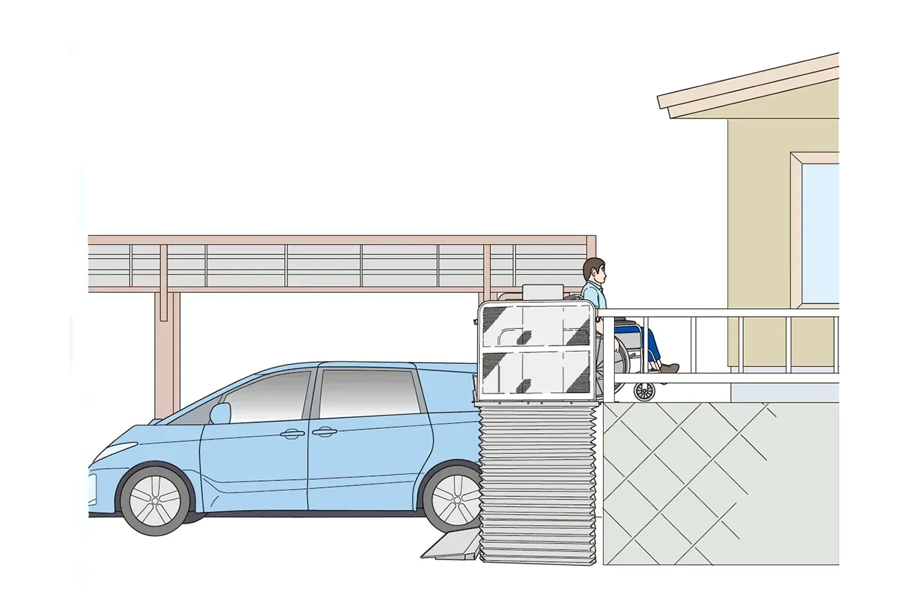 - 玄関からカーポートまでの 幅広い場所の段差に設置可能な電動油圧式段差解消機。