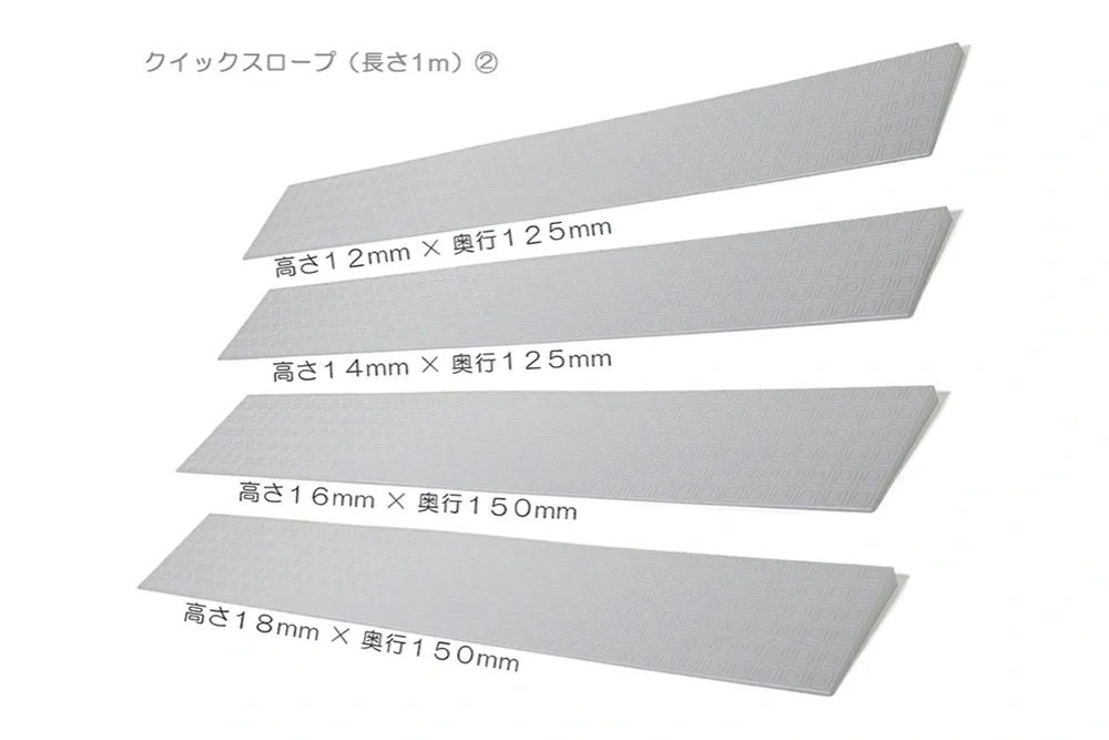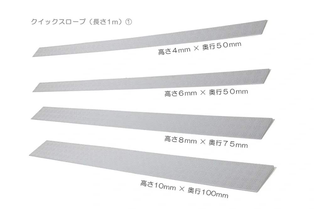 ご自宅の敷居など、ちょっとした段差にも対応できます。 - 高さ4mm,6mm,8mm,10mm,12mm,14mm,16mm,18mmの8種類があります。