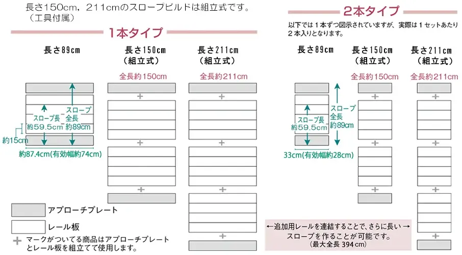 | 種別 | スロープビルドの長さ | 適用段差(目安) | 重量 | 幅 | 耐荷重 | ガードの高さ | |||