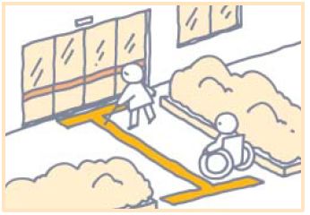 建物の出入口に通じる通路を車いすで円滑に利用できるようにすることが必要です。広い幅ですべりにくい表面とし、高低差のある場合には緩やかなスロープ等を設けてください。