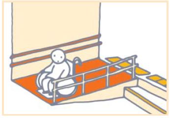 スロープは緩やかなものとし、手すりを設け、上端には点状ブロック等を敷設してください。長いスロープには踊り場を設けることも必要です。