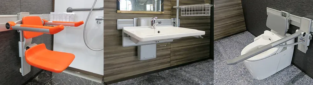 特色は、トイレの手すりや洗面台などを使用者に合わせて、高さ、位置、幅などを任意に設定できるので、身体の状況、機能にあわせて、変更でき、ご自身で安全にトイレや洗面をすることができます。また従来の障害者用トイレなどと違い、美しいデザインの製品とその組み合わせを実現しました。
