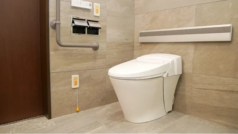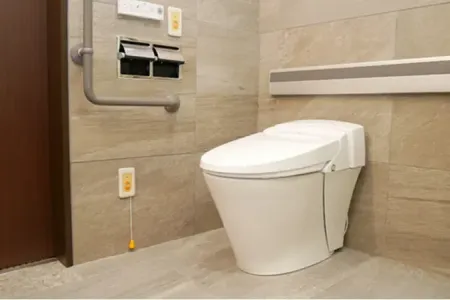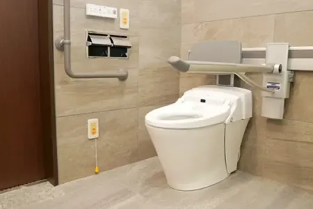 トイレ周辺には、デザイン性に優れたアビリティーズ・ケアネット社の着脱式折り上げ手すりを採用しました。