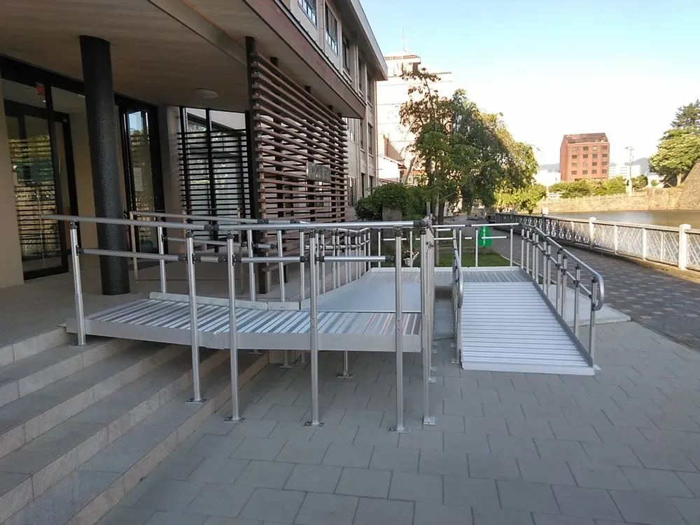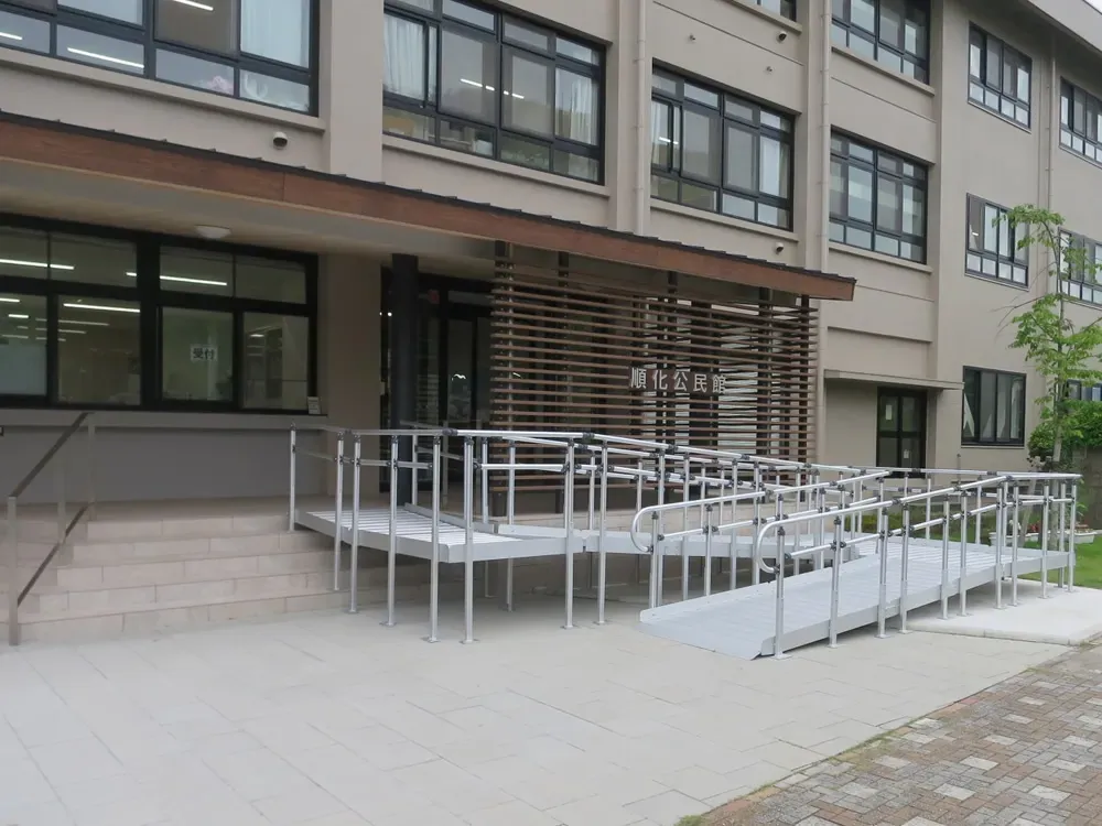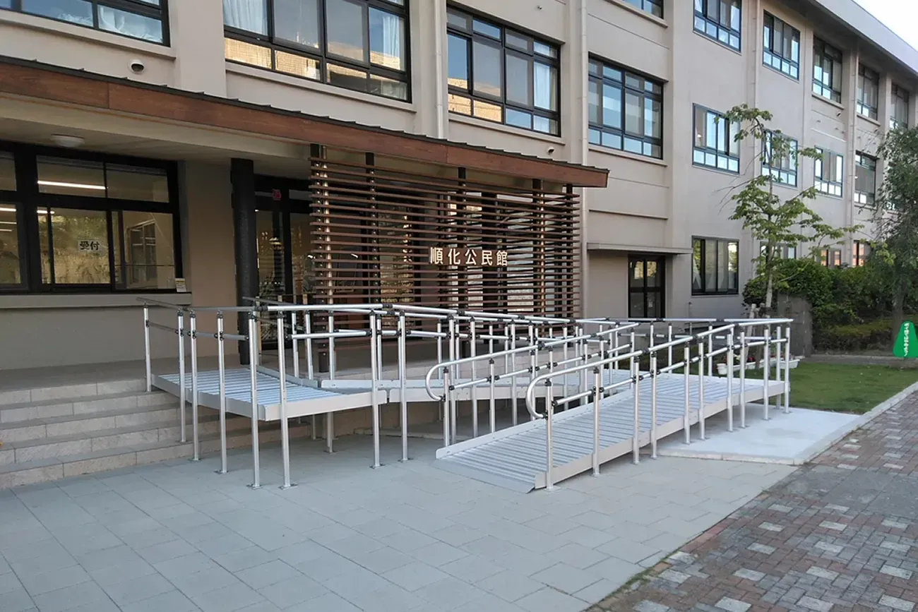 公民館には地域の方々が行事等で出入りすることが多くあり、高齢者や車いすの方、ベビーカーや歩行器などを使い生活される方々が自由に出入りできるように、”手すり付き組み上げスロープ”をご採用いただきました。