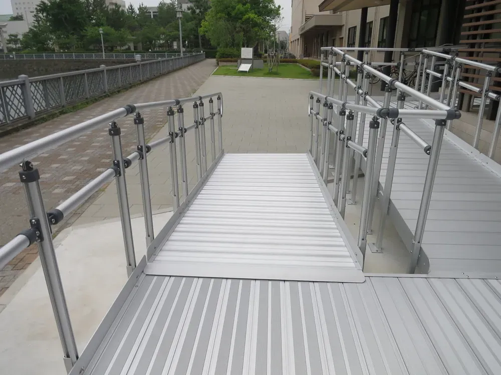 福井市 順化公民館の外階段、手すり付き組上げスロープで段差解消