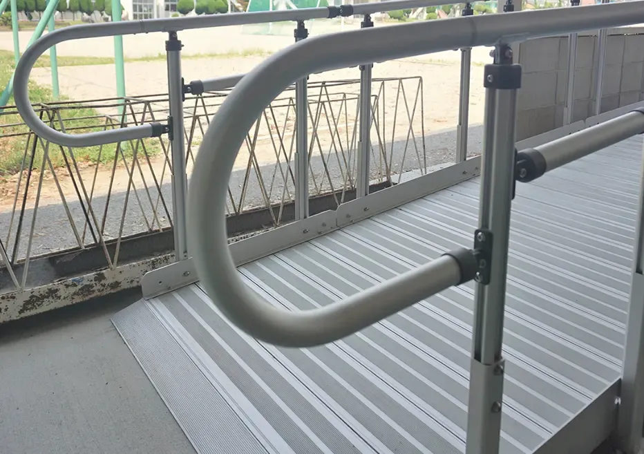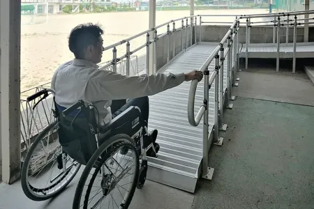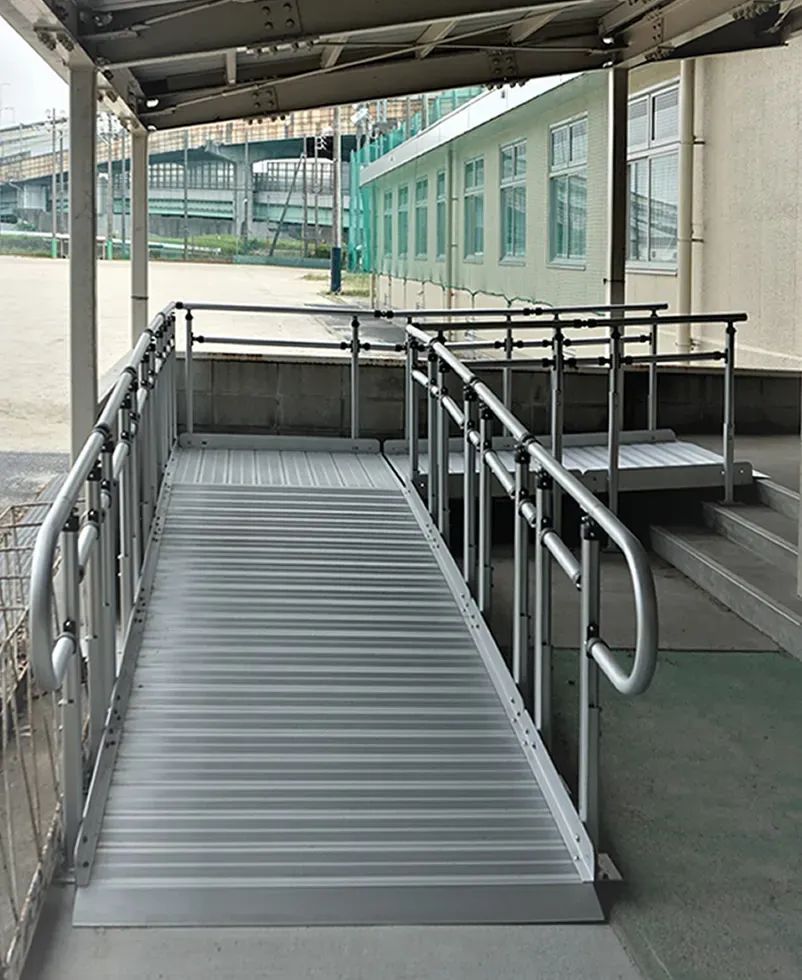 特に、体育館校舎入口には3段の屋外階段があるため、アルミの手すり付きスロープを設置し、自由に出入りできる環境を整えました。