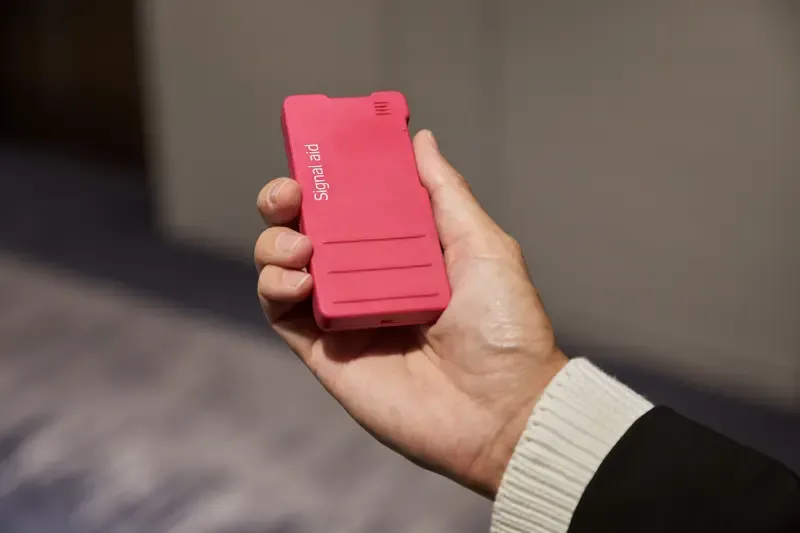 このシステムは、視覚に障害がある方が小型送信機(シグナルエイド)を持ち、その本体にあるボタンを押すと天井スピーカーからフロアの情報や位置を音声で知らせてくれます。音声システムは社会全般に広まってきており、今では多くの視覚に障害のある方が小型送信機を所有しています。フロントで小型送信機を貸し出しています。