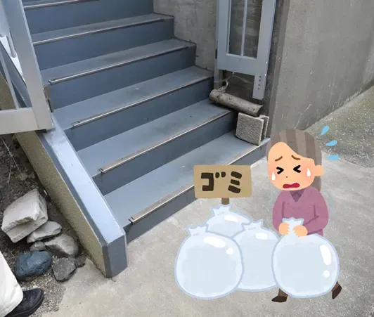 ごみ収集場所へ行く際に階段があり、歩行困難者はごみ捨てが難しい。