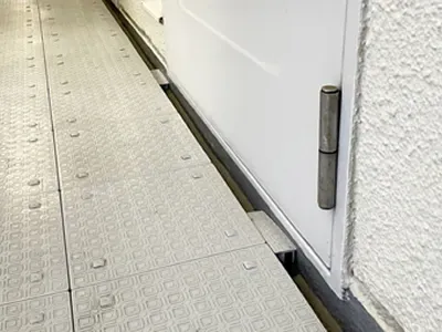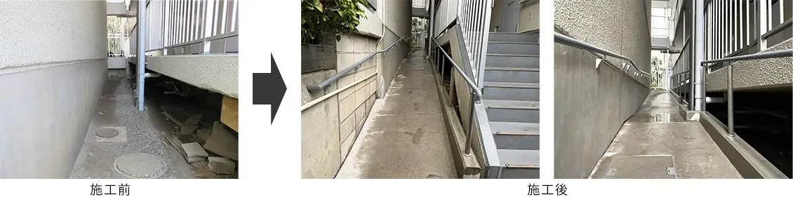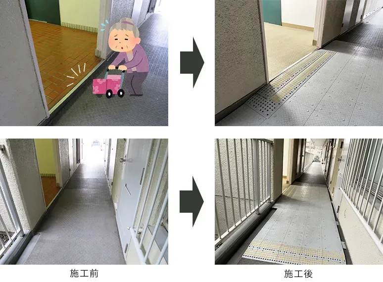 施工前は段差部分でベビーカーや買い物カート等を持ち上げる必要がありましたが、施工 後はスムーズにエレベーターホール⇔共有廊下を移動できるユニバーサルデザインになりました。電動車いす使用者の方も、降車せずとも安全にお一人での外出が可能となりました。