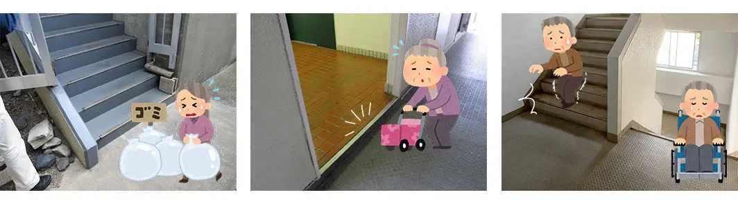 Kマンションでも、1階の床が高くゴミ収集場所へ行く際に階段を昇降する必要がありました。 ご入居者の中には重たいゴミ袋を持つため台車を利用してゴミ出しをしていましたが、数段の階段がバリアとなっていました。