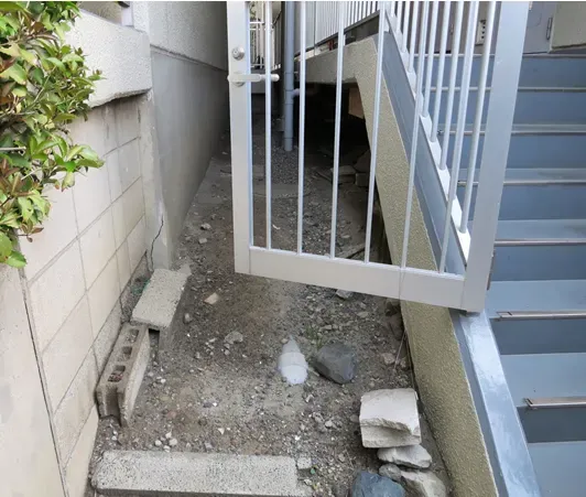 階段の段差解消の検討において階段横の空き地の活用が候補に上がりました。(写真はスロープ施工前の階段横の空き地)