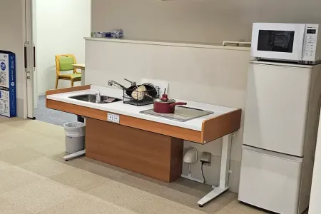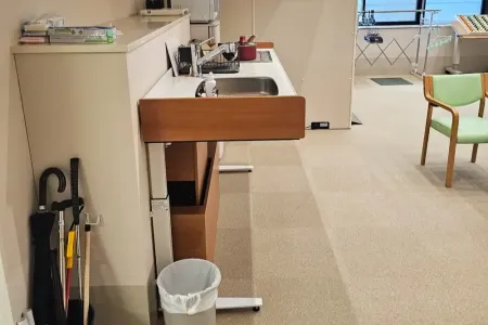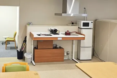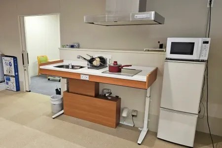どのように退院後の生活を構築していくのか、特にキッチンにおける生活動作と環境の確認をおこなう上で、ご自宅で生活するイメージを持ちやすい家庭的なデザインと、調理台を身体状況に応じた最適な高さに調節可能な昇降式“ユニバーサルキッチン”を採用しました。