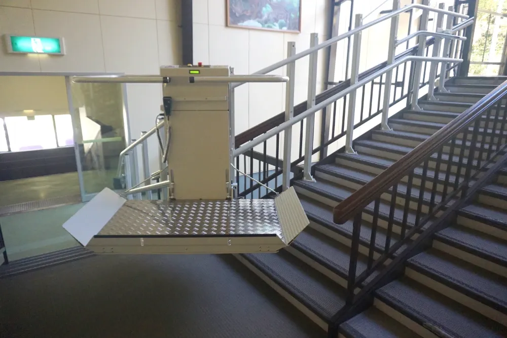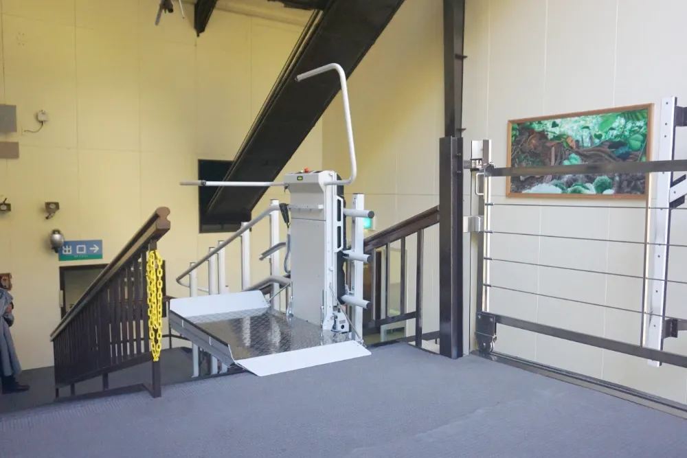 第二ロープウェイ駅舎にはエレベーターや多目的トイレが整備される一方で、建築年代の古い第一ロープウェイ駅舎では、従前から設置されていた「いす式階段昇降機」の老朽化により、車いす利用者はもちろん多様な方が利用することを考えると乗降が難しいことが課題となっていました。