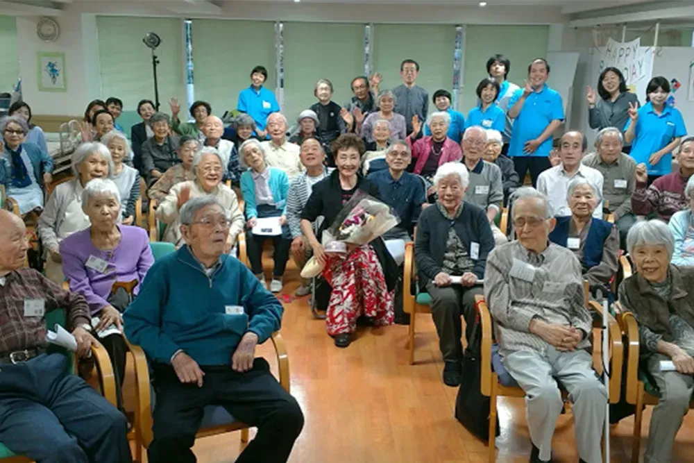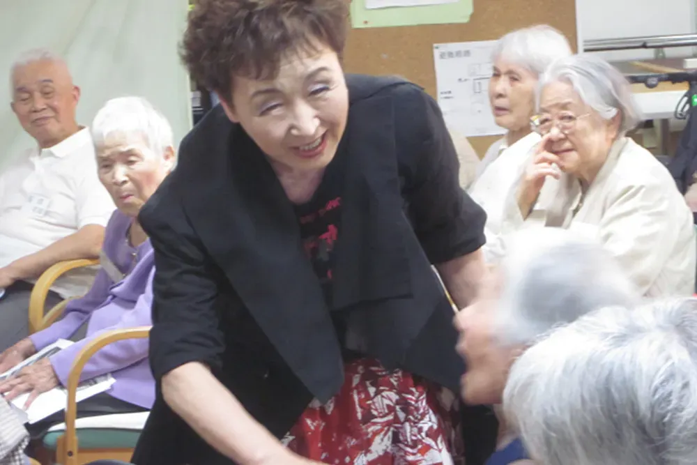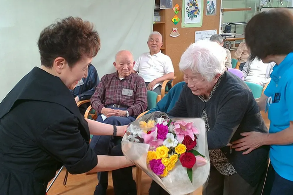 2017年5月18日 日本アビリティーズ協会の顧問でもある加藤登紀子さんが、アビリティーズ デイサービス萌気園に来園されました。 加藤さんは、参加者席の中に入って、近くで寄り添いながら、素敵なお話をたくさんしてくださりました。参加者の皆さんは、笑ったり、感動したりで大喜びでした。