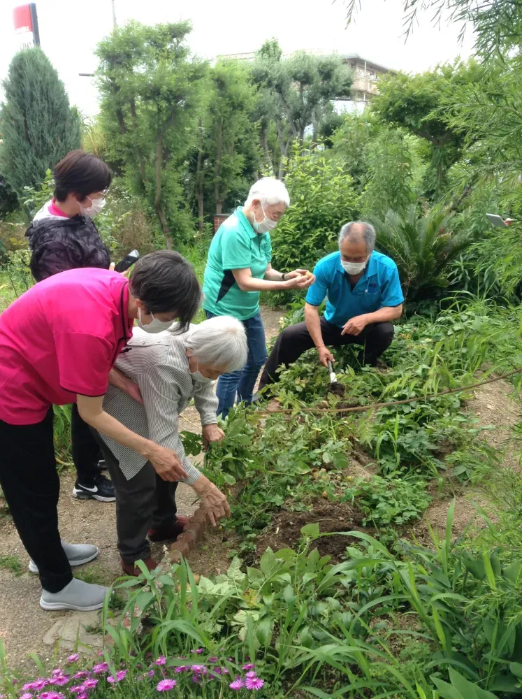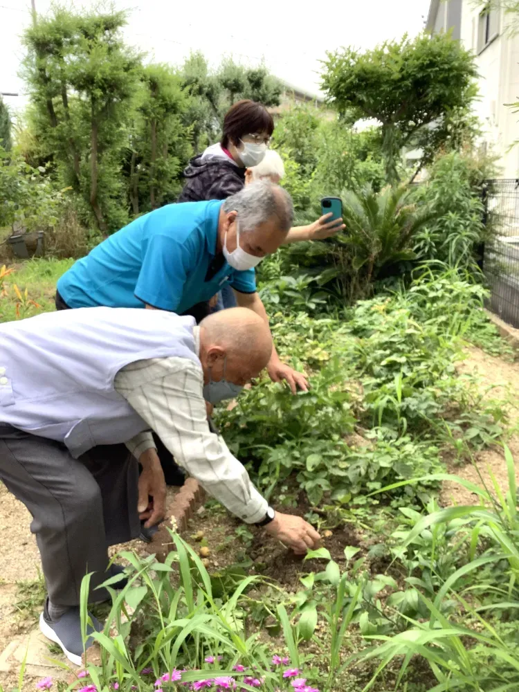 ご利用者の皆様も、テラスから眺めたり、庭園で歩行訓練をする際に観察したりと、じゃがいもの成長を楽しみにされていました。