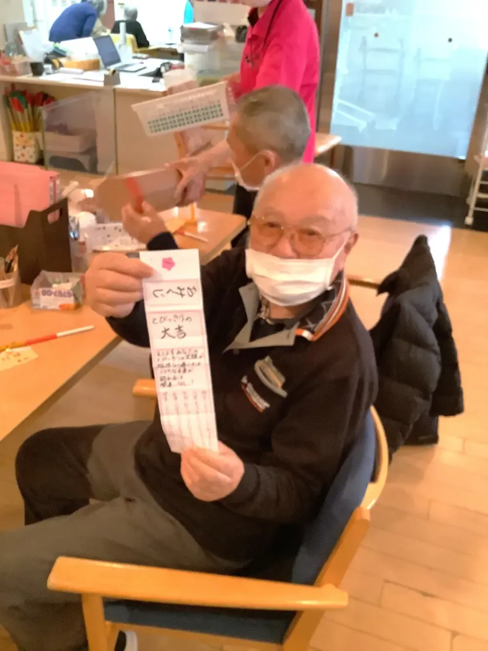 「足も弱っているし、今年のお正月は特に寒かったので、初詣に行けなかった。ひだまりでお参りができて良かった!」「抹茶が美味しかった!」「書初めをして、子供の頃を思い出した!」「おみくじで大吉が出たので、今年はいいことがありそう!」など、ご利用者の皆様には、日本の古来から続くお正月行事を満喫していただけたようです。