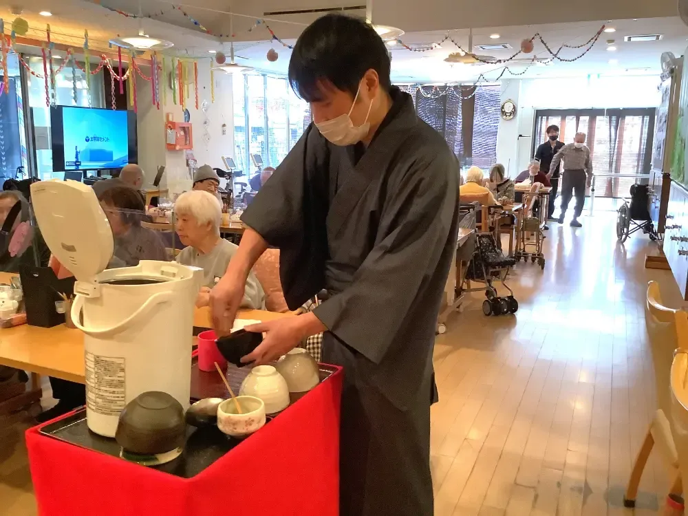 今回は、職員がお席の近くまで「お抹茶セット」をお持ちし、利用者様にも点てていただきました。