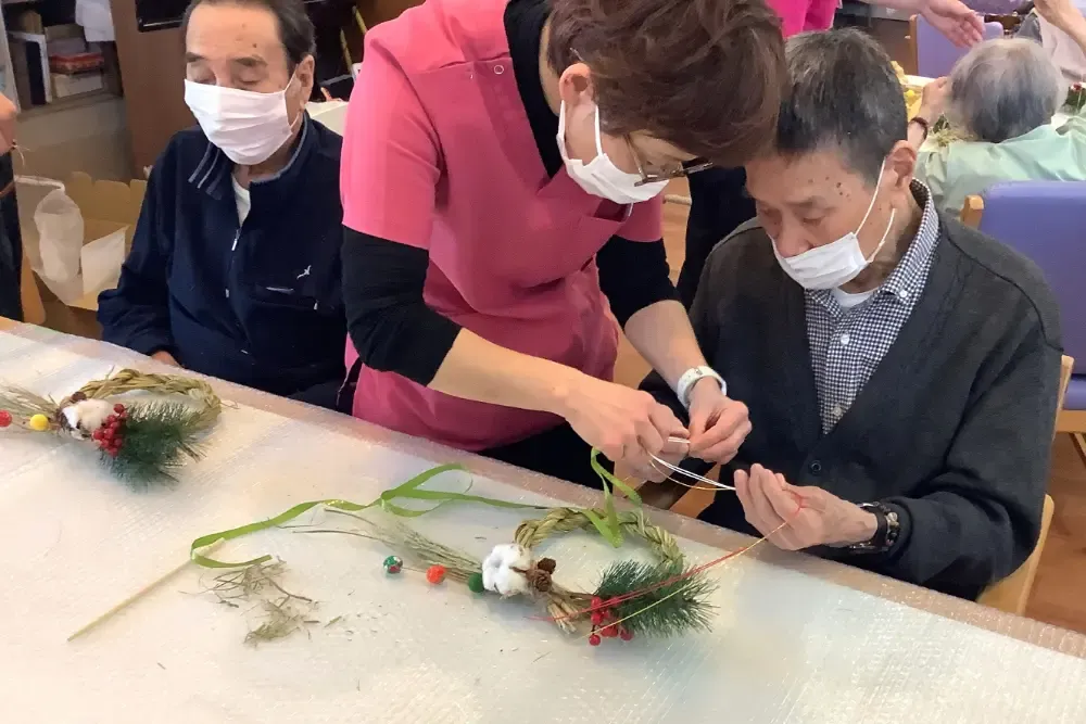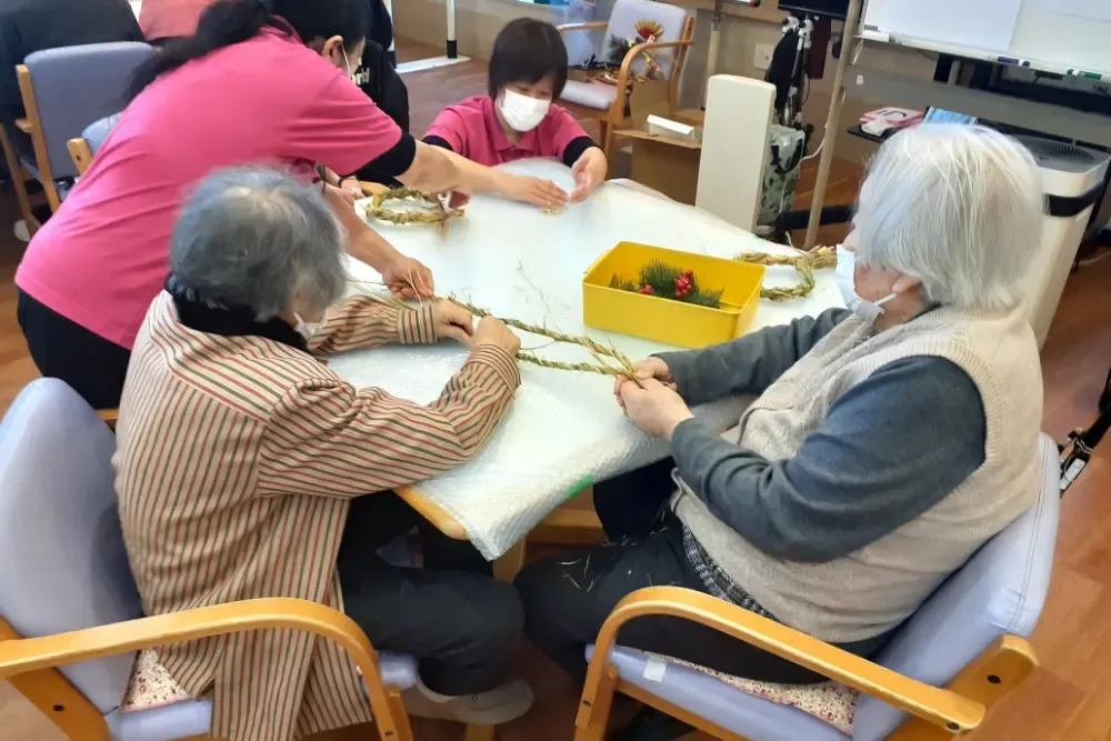 デイセンターつどい奈良北では昨年末に、今年のお正月に向けて、みんなで「しめ縄づくり」に取り組みました。