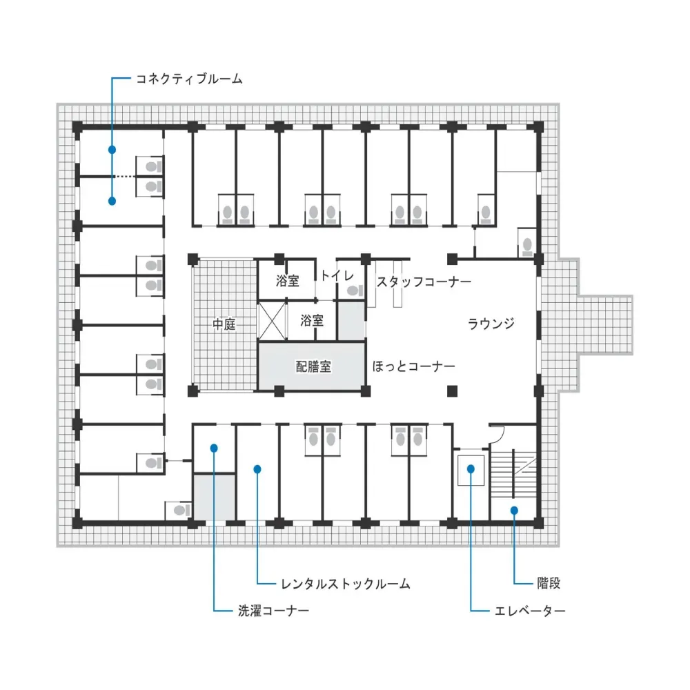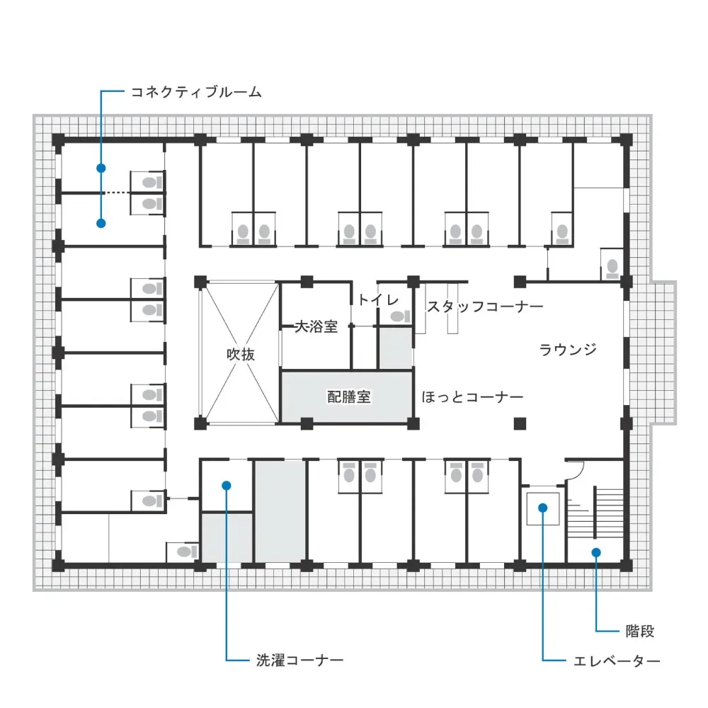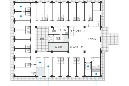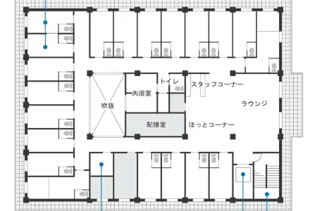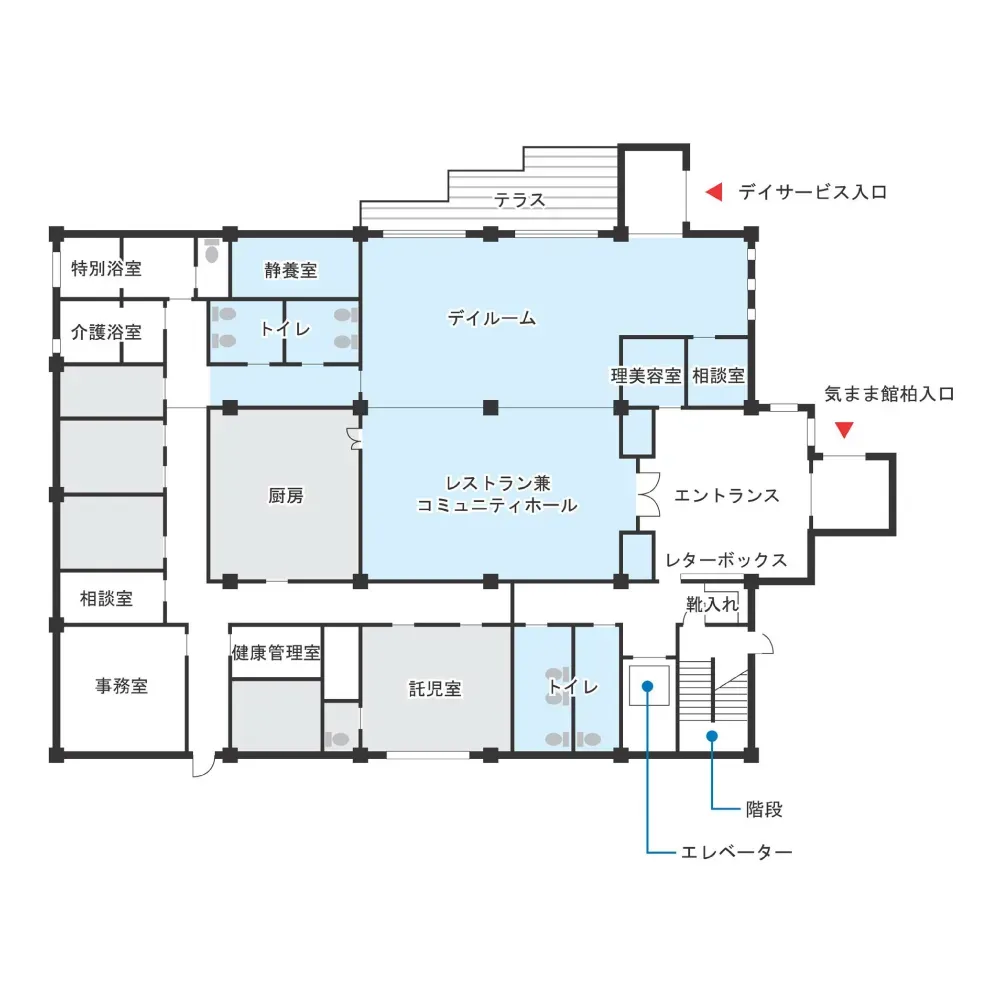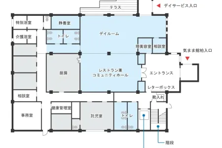 | 共有設備 | スプリンクラー、健康管理室、相談室、食堂兼機能訓練室、介護浴室、トゴール浴室、特殊浴室、応接室、共用トイレ、エレベーター |