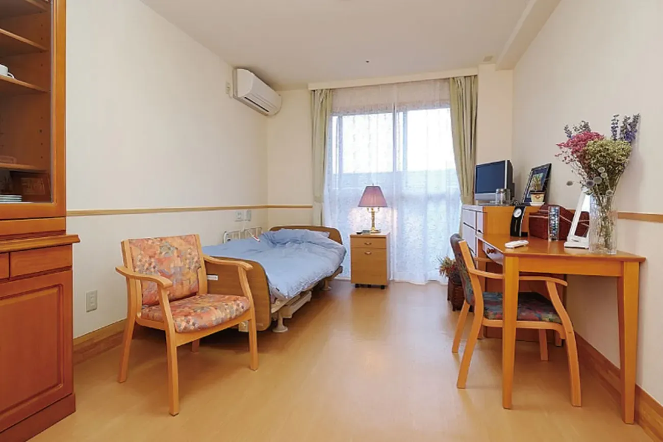各居室には 介護用ベッド・昇降式洗面台・クローゼット・カーテン・ウォシュレット・エアコンが備えつけられています。