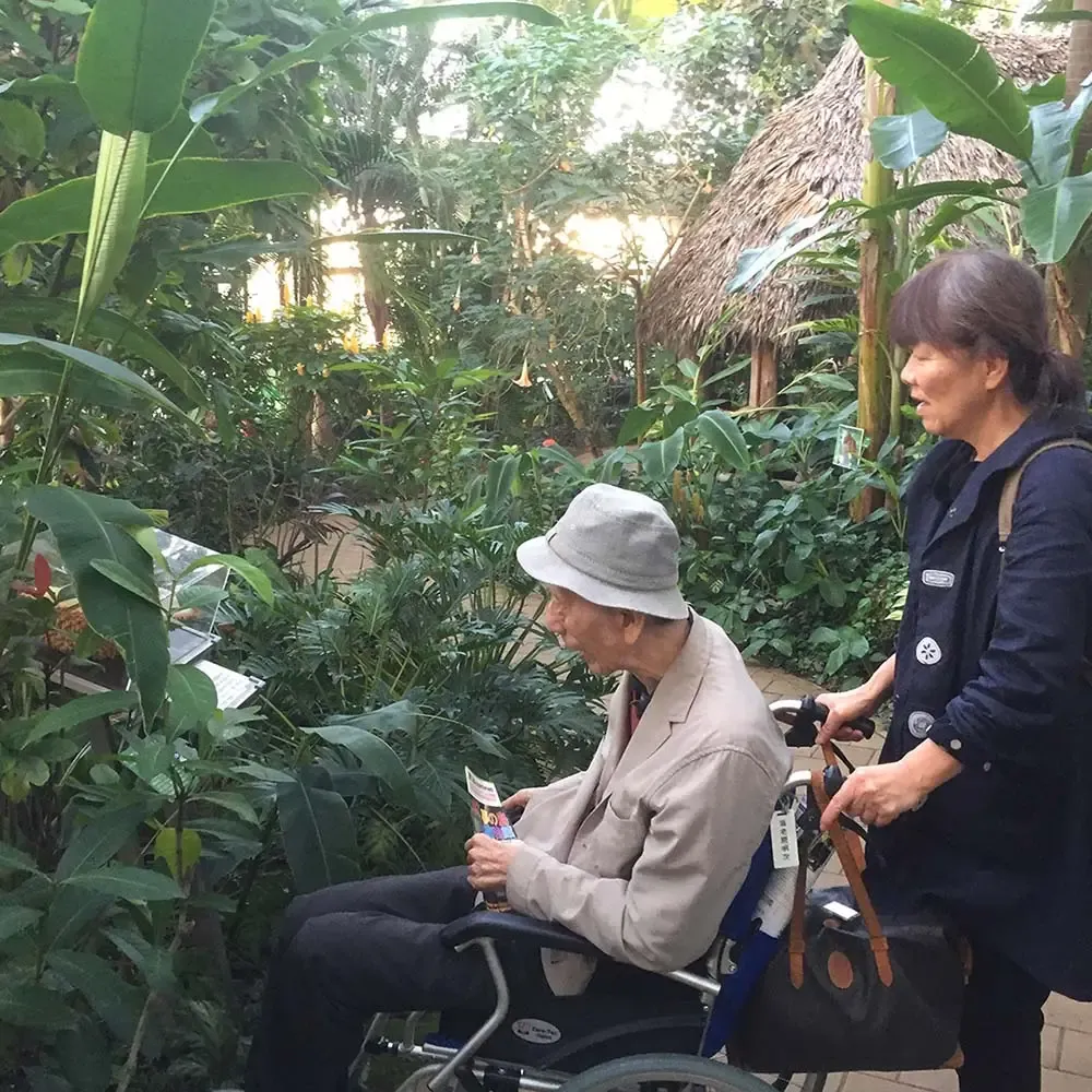 通常は入口近くの駐車場で降車して結構な距離を移動する必要がありますが、事前に申請すれば植物館の目前まで車で入っていけます。