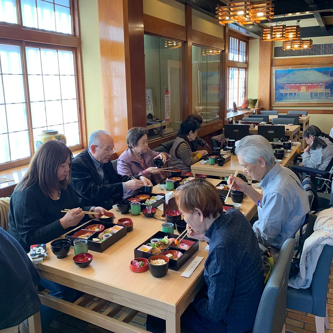 食事も美味しく彩りもきれい。鳩サブレのお土産もいっぱい買って楽しいひとときでした。