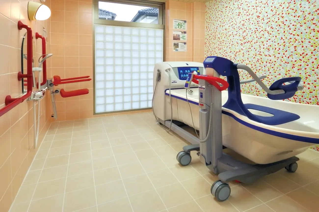 福祉先進国スウェーデン製の昇降式浴槽とリフトチェアを導入し、椅子に座ったまま湯船に浸かることができます。