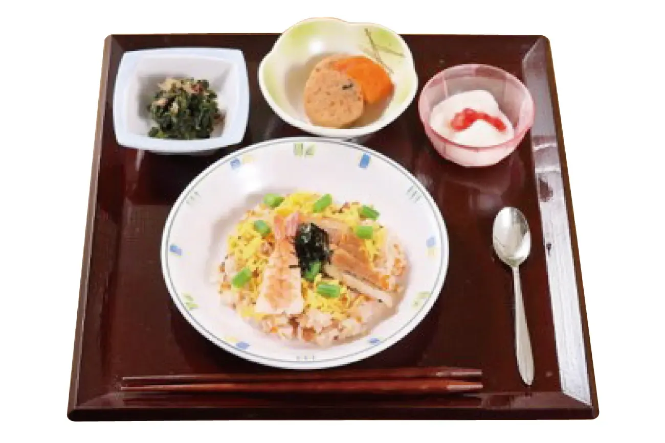 管理栄養士による献立は、栄養・塩分等のバランスを考慮し、かつ美味しく味わっていただくために、召し上がる時間に合わせて最終調理しご用意します。