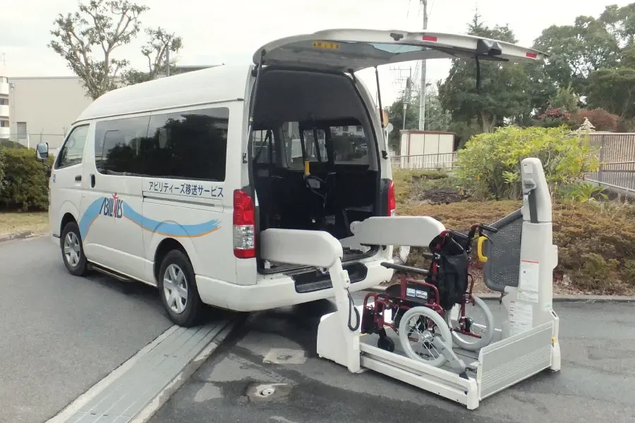 送迎車は、スロープもしくはリフト、そして安全な車いす固定装置を装備しています。