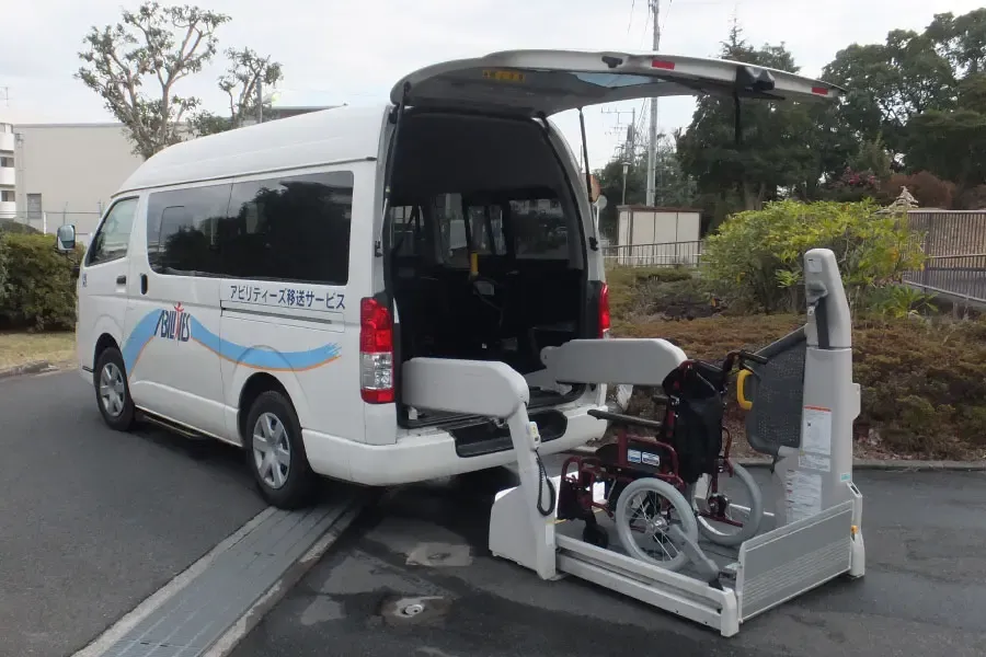 送迎車は、スロープもしくはリフト、そして安全な車いす固定装置を装備しています。