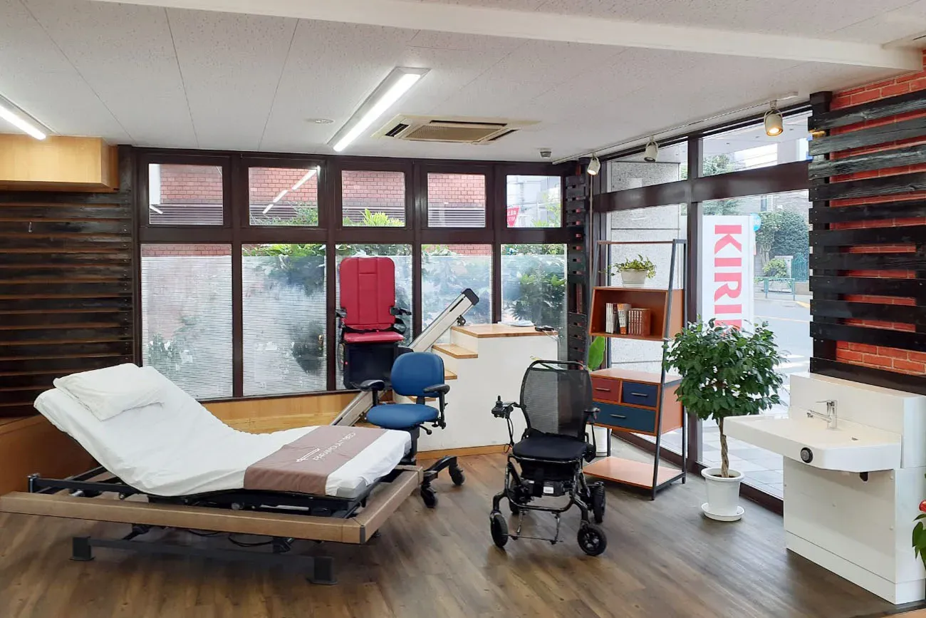 初めて福祉用具を検討する方や日頃の介護でお悩みの方が、具体的な福祉用具のイメージがもてるようなショールームを併設しており、実際に車椅子・介護ベッドや段差解消機、階段昇降機を体験していただくことができます。