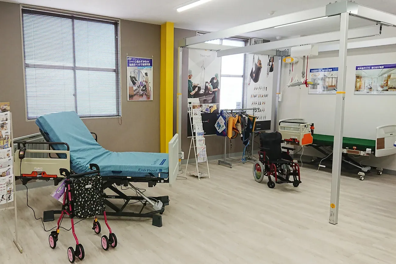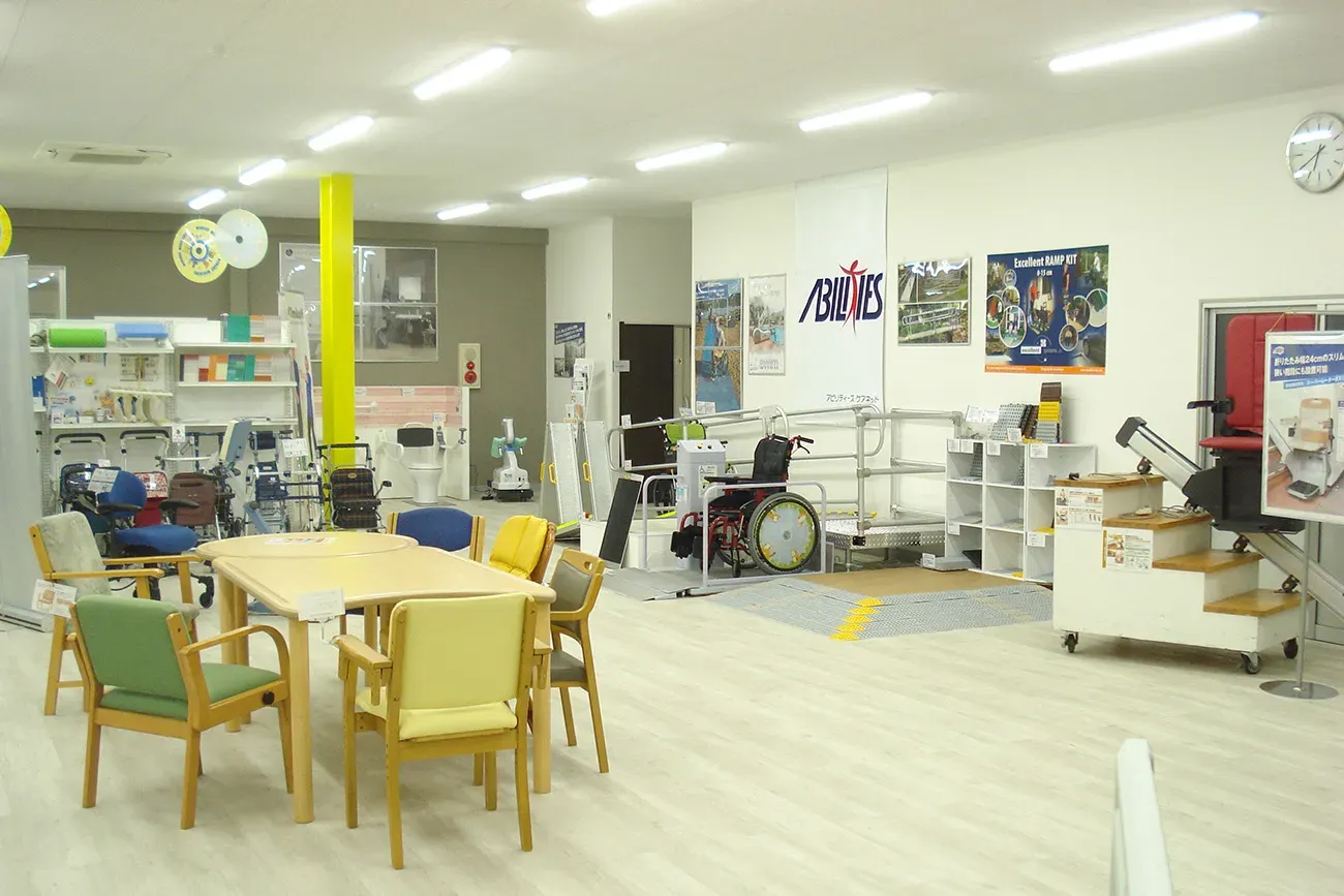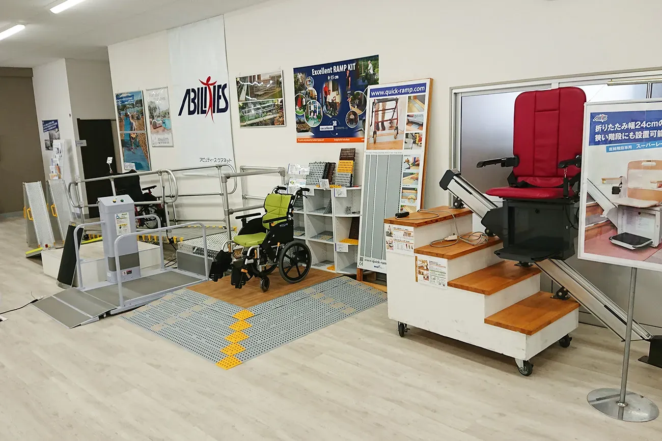 2019年1月に現在の営業所場所への移転に伴い、200㎡を越える大型ショールームを併設致しました。ショールームでは車いす、リフト、バリアフリー機器、特殊浴槽などの他では見られないアビリティーズ独自のオリジナル商品を多数展示しています。実際に商品を手に取り体験していただく事ができ、障害のある方や身体機能の低下した高齢の方の自立を支援し、介護負担を軽減するための福祉用具のご相談・ご提案を承っています(予約制)。