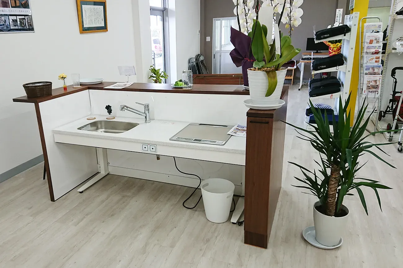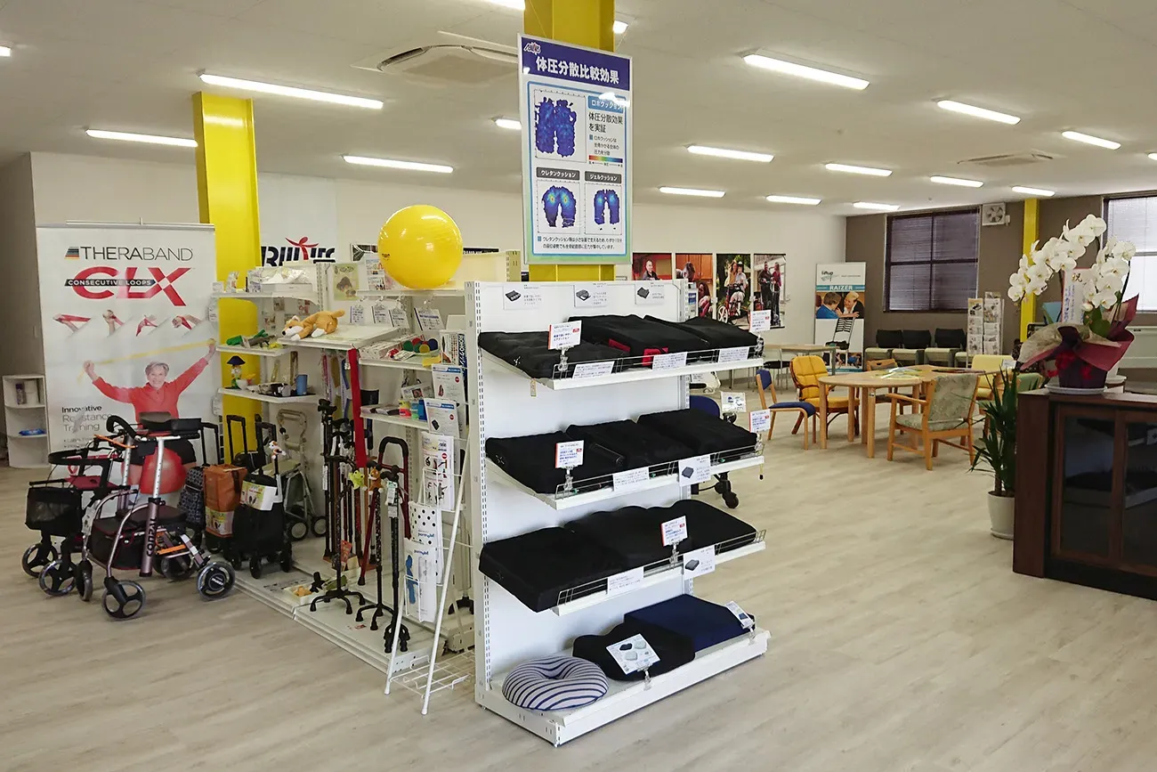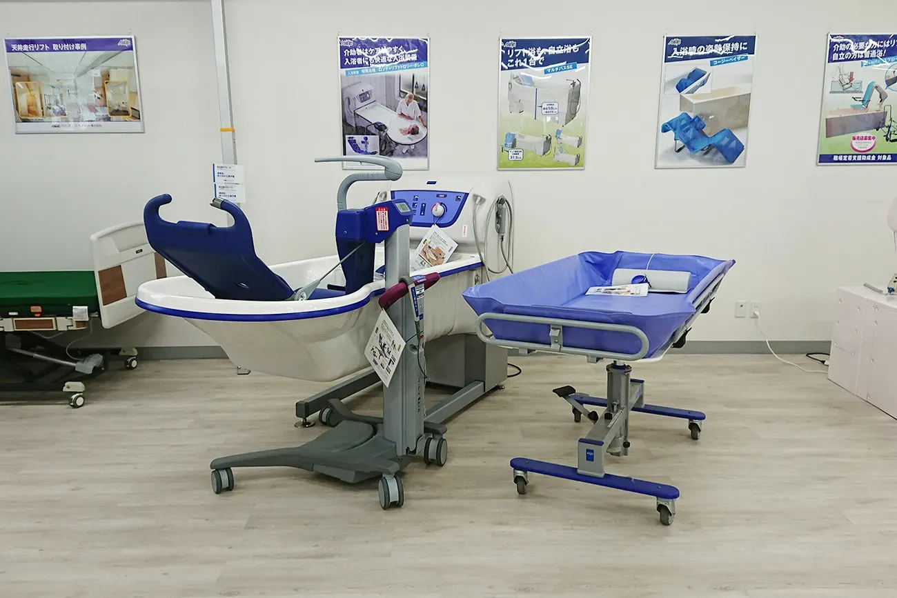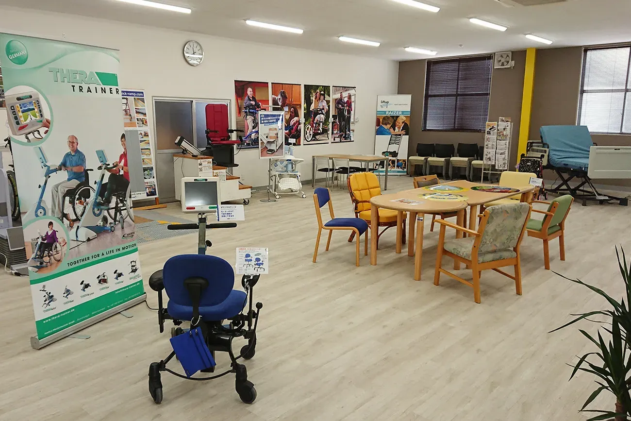 2019年1月に現在の営業所場所への移転に伴い、200㎡を越える大型ショールームを併設致しました。ショールームでは車いす、リフト、バリアフリー機器、特殊浴槽などの他では見られないアビリティーズ独自のオリジナル商品を多数展示しています。実際に商品を手に取り体験していただく事ができ、障害のある方や身体機能の低下した高齢の方の自立を支援し、介護負担を軽減するための福祉用具のご相談・ご提案を承っています(予約制)。