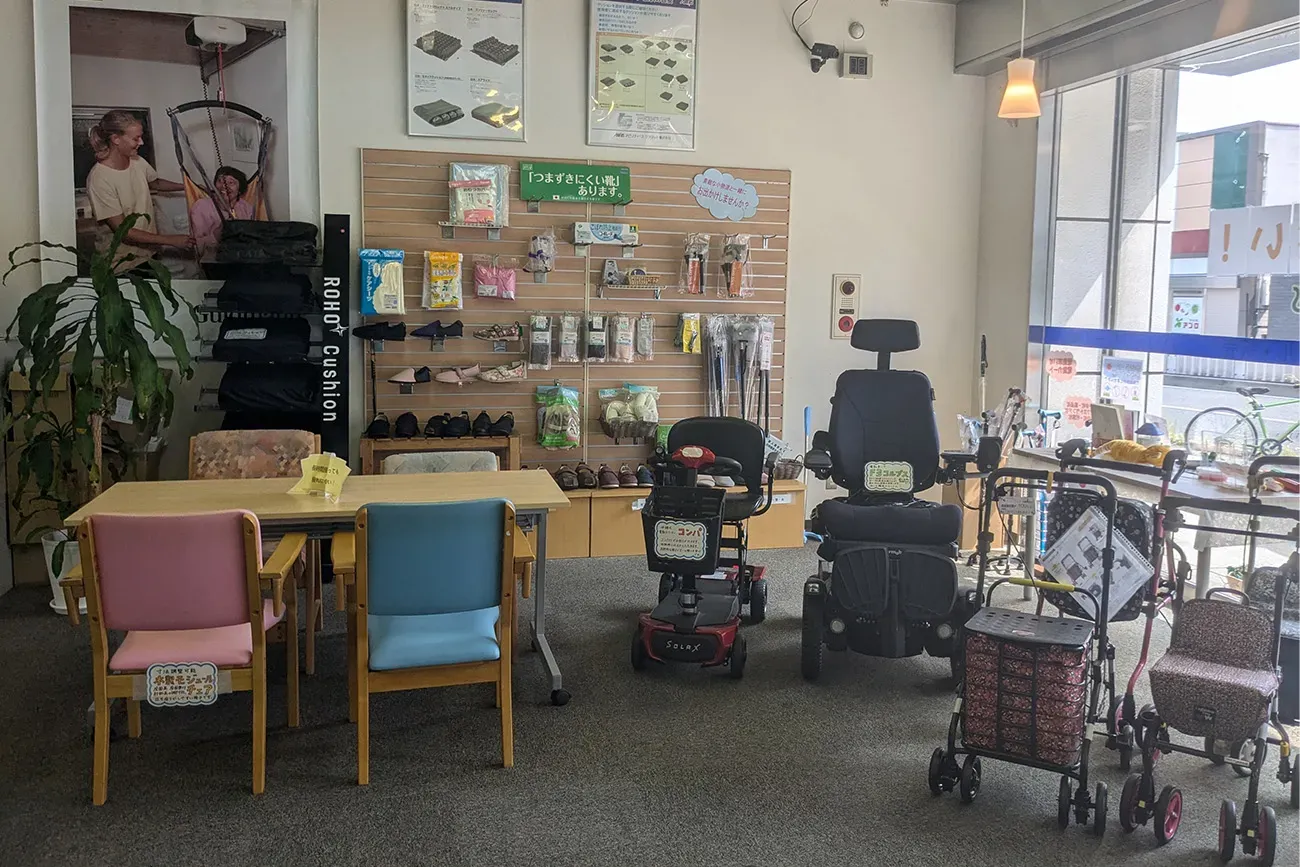 ここには、病院や施設などを担当する施設営業、介護保険福祉用具貸与・販売事業と障がい制度を中心とした在宅営業、関西バリアフリー課、NPO法人 日本アビリティーズ協会大阪事務局があります。営業所一階には、最新のリハビリ福祉機器を始め、入浴用品やシルバーカー、杖、靴など身近な介護用品も展示しており、試乗体験や購入をすることができます。また、介護福祉機器の勉強会やセミナーも開催しており、商品だけでなく最新の情報発信も行っています。