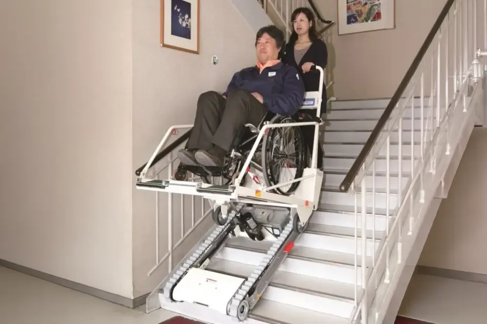 「階段昇降機」と「階段昇降車」のタイプがあり、前者は階段にレールを設置し昇降するもので、後者は昇降装置自身が階段を昇降します。
