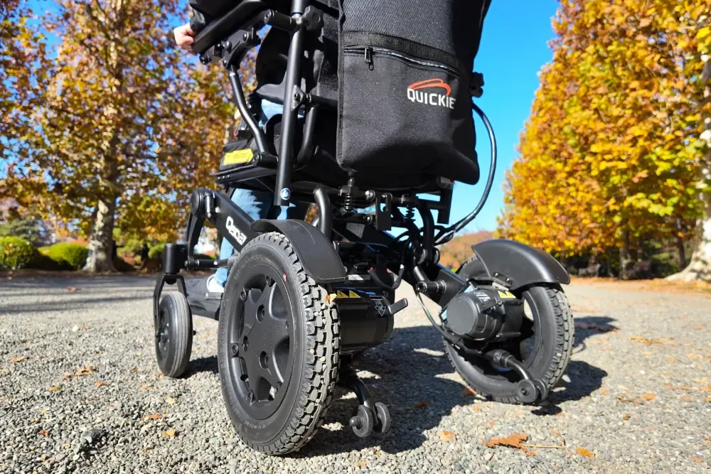 Q50Rアルミニウムフレームのタイヤは、キャスター8インチ・駆動輪12インチと大きく、長く続く砂利道や芝生、芝生の傾斜の上り下り、落ち葉の上、5cmの段差なども難なく乗り越えることができました。