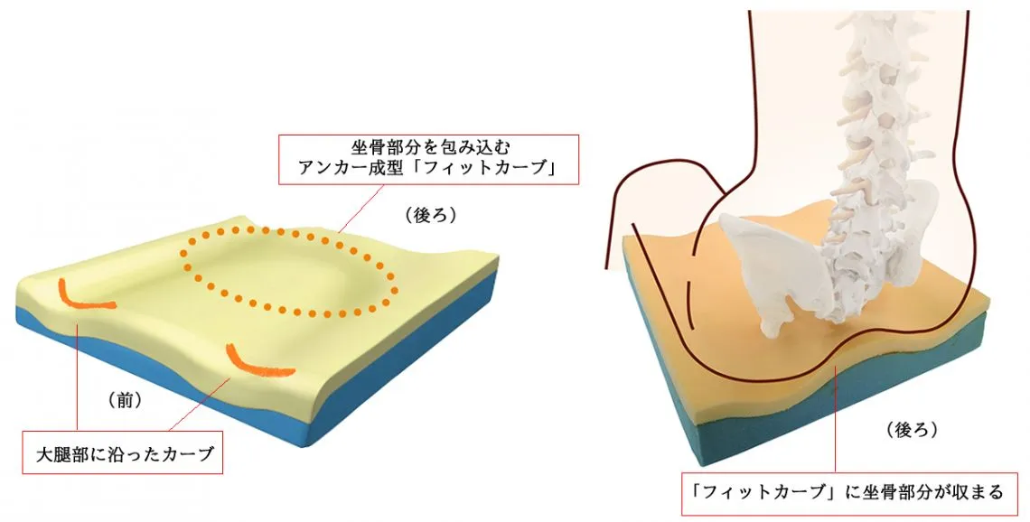 「フィットカーブ」に坐骨部分が包まれて骨盤と大転子部分が保持されます。さらに大腿部に沿ったカーブで脚の位置が適切に保持されて内転や外転を予防しますので、座位姿勢が安定します。