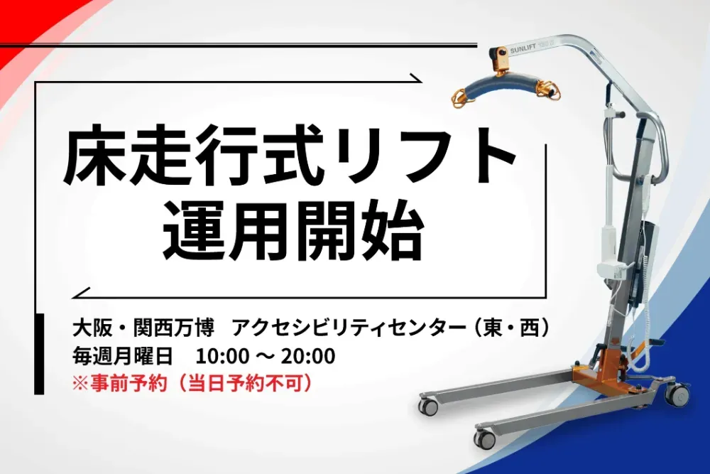 大阪・関西万博のアクセシビリティセンター(東・西)に、床走行リフト「サンリフトミニ」の貸し出しを実施しています。