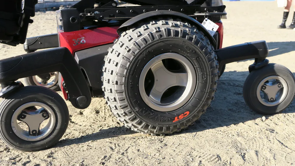 コンパクトなアクティブ電動車いす「マジック360」は、2つの異なるタイヤホイールを選択することで、今まで行くことが難しかった様々な環境で走行できます。