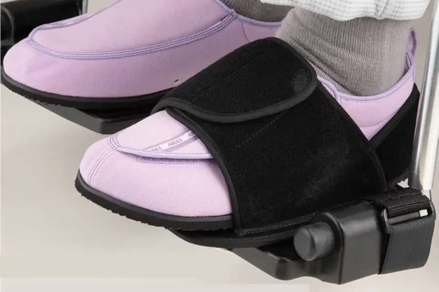 車いすのフットレストから足が落ちるのを防ぎます。介助者から見えにくい、足元の安全対策に。