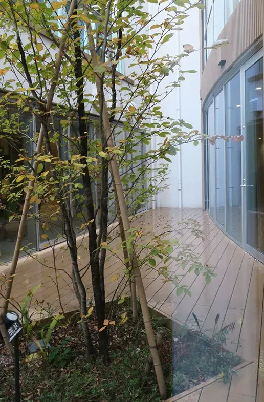 大きなガラス曲面に囲まれたパティオ(中庭)。