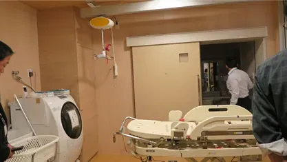 居室全室にリフトを設置しているとのこと。居室を面移動できるルームカバーリング方式の採用で、ベッド移乗やトイレへ移動などの室内の移動が容易です。ベッドの配置変更なども行えます。リフトのサポートで排泄姿勢も安定です。移動介助自体は片手の軽い力で可能です。