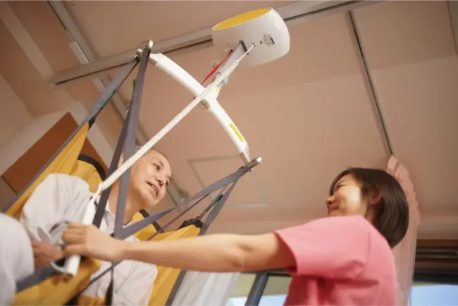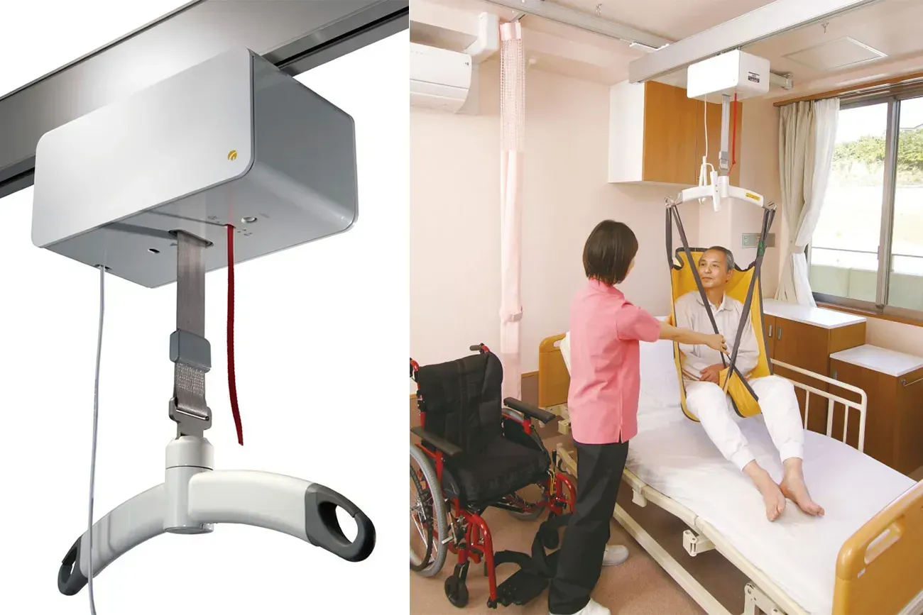 施設職員は移乗の研修を定期的に実施し、スキルアップを行っているとのこと。見学した施設の天井走行リフトは、当社が提携している世界最大の介護用リフトメーカー、デンマーク・グルドマン社製でした。