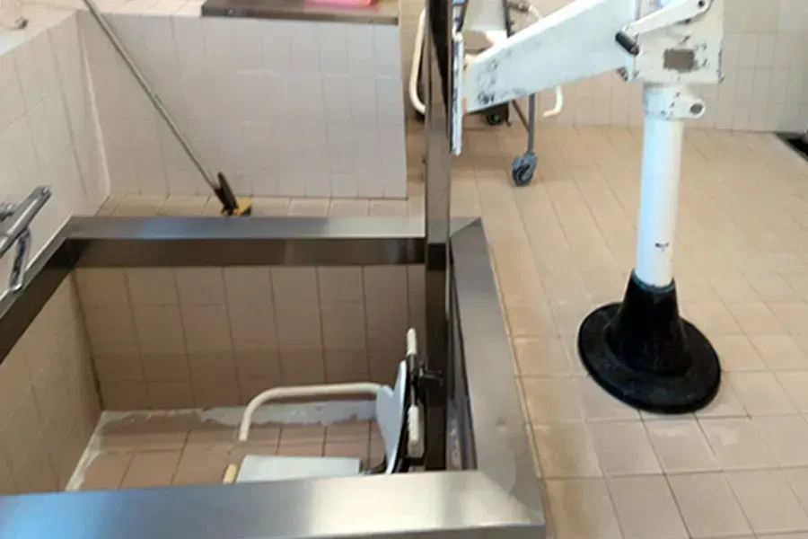 買い替えにあたり、特段の浴室及び浴槽の改修を要しない後継機種のアクアポートELを導入しました。新タイプは電動昇降ができることが最大のメリットであり、職員からも以前のアクアポート(手動)に比べて格段に利用しやすいとの声で、職員の負担軽減にもつなげる狙いで導入されました。