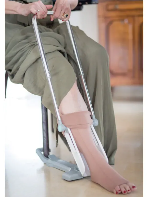 ストッキーに弾性ストッキングをセットし、フックを椅子に引っ掛けるようにして床に置きます。スピラドゥを足先から脚に巻き付けた後、足先をストッキーに通し、膝の高さあたりのレバーを掴んで引くとあんなに苦労した弾性ストッキングがスルスルと。しかも、前かがみの時間も短時間で苦痛無しで履けます。
