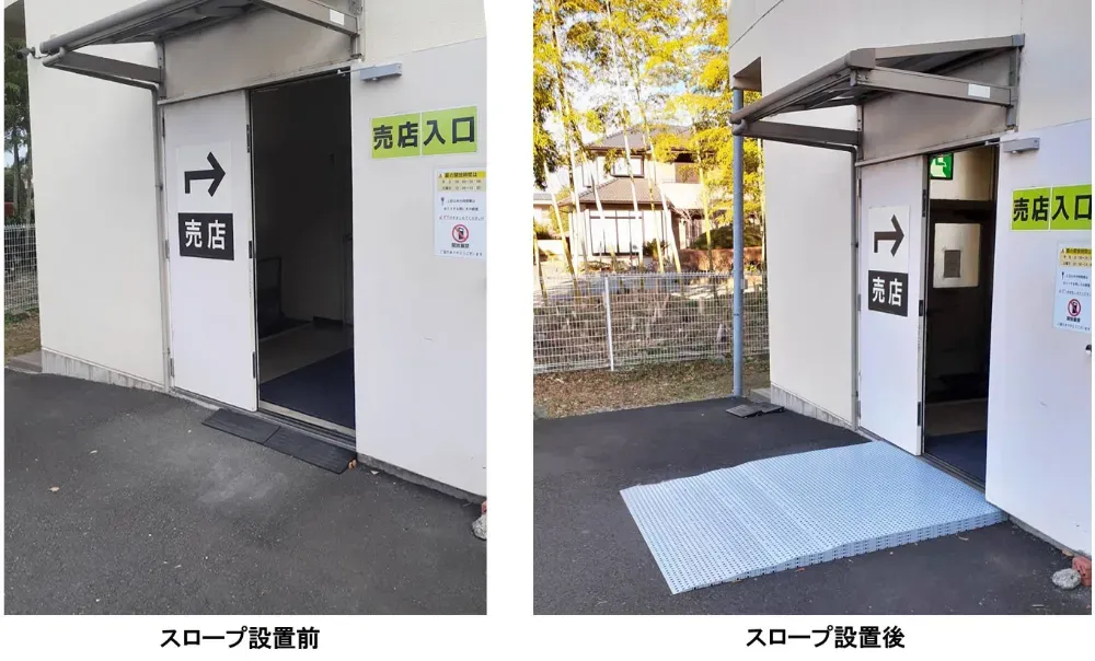 ご相談いただいた病院は本棟とは別に売店があり、売店出入口には段差があります。 入口段差には、ホームセンターで購入した簡易的なスロープを設置していました。 患者と売店スタッフの双方にとって負担となっていたため、インターネットでスロープを探し、弊社の“ブロックビルド”を見つけお問合せいただきました。 ブロックビルドは小さい部材を組み上げるタイプのスロープなので、個別の段差に応じた設置が可能です。 売店棟への出入り口のドア枠にどうしても段差が残ってしまうため、スロープ上段側に踊り場を設けることで車いす使用者が一人でも行き来できるようにしました。 導入後は、片麻痺の足漕ぎをしている患者でも一人で行き来できるようになり負担が軽減されているようです。